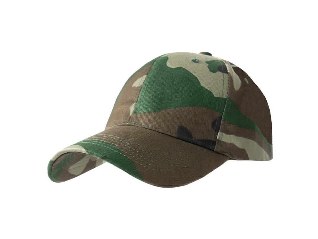 Nízkoprofilová pětipanelová army kšiltovka v provedení Woodland. Polstrovaný potní pásek, univerzální velikost nastavitelná pomocí pásku s kovovou přezkou.