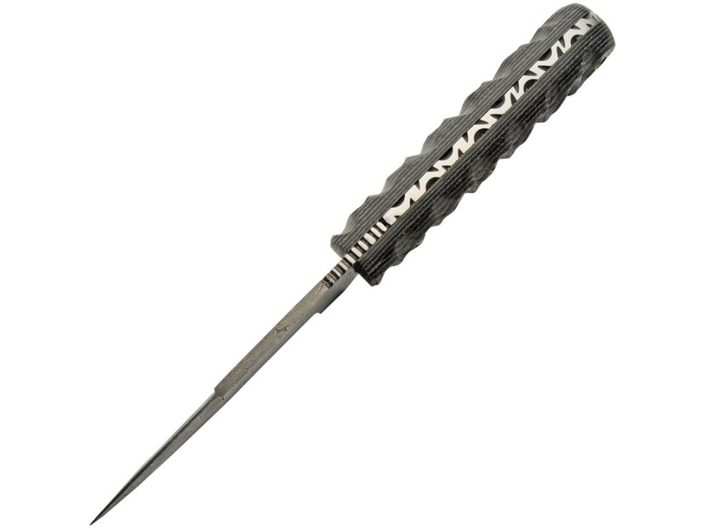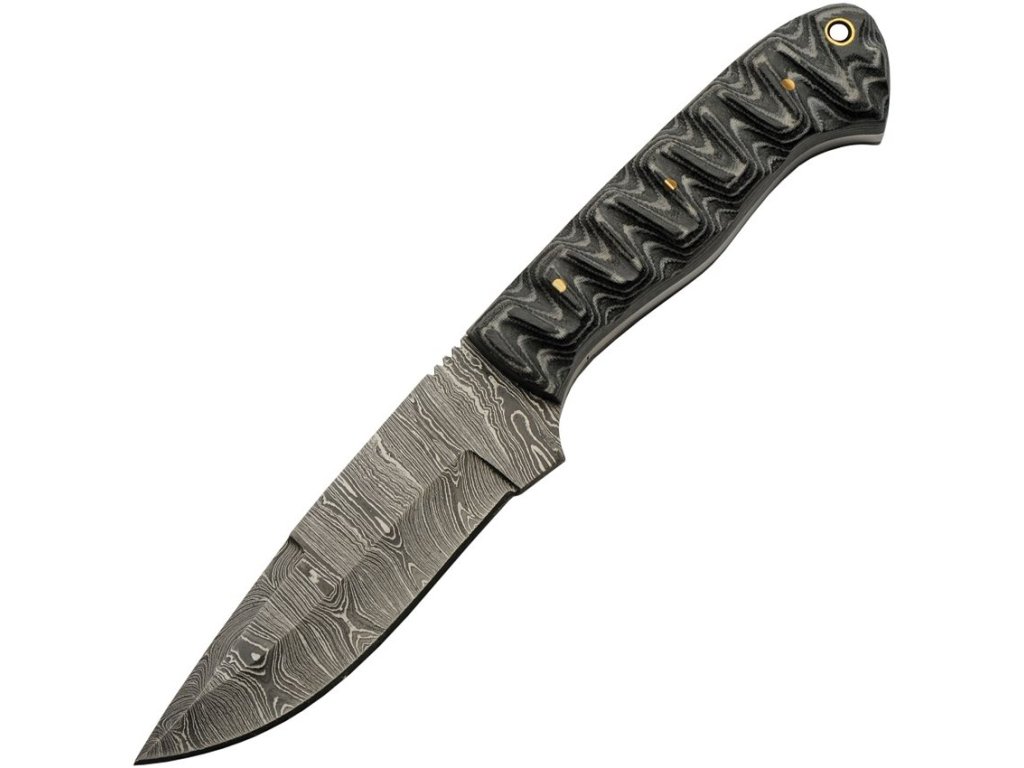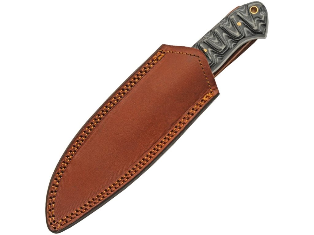 Nůž s hladkým ostřím a pevnou čepelí z damaškové ocele, která je zasazená do micartové, černobílé, rukojeti. Celková délka nože - 228,6 mm, délka čepele - 108 mm. Včetně koženého opaskového pouzdra.
