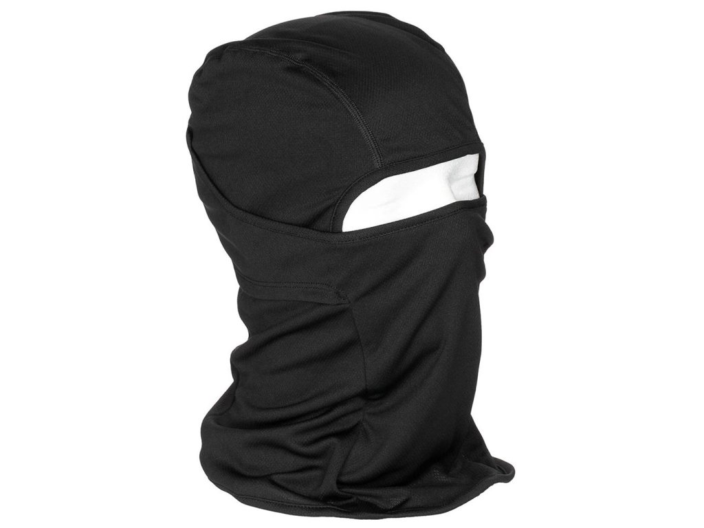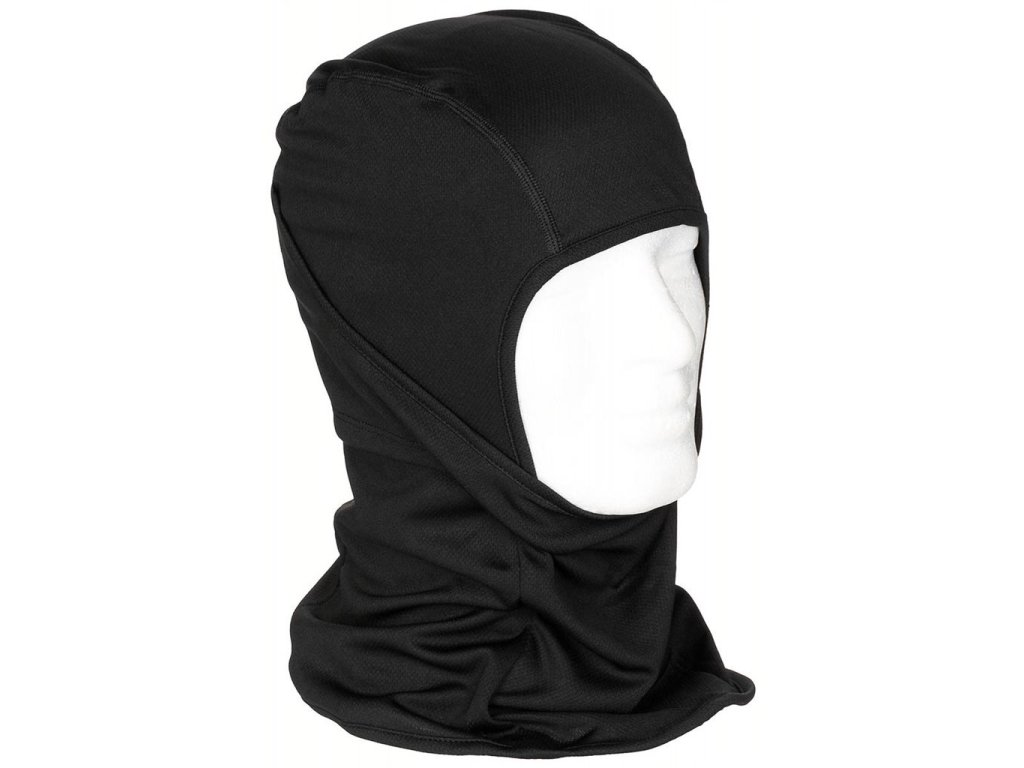 Jednootvorová kombinovaná kukla v černém provedení. Je vyrobená z prodyšného a elastického materiálu, který skvěle odvádí vlhkost. Přední část s překrytím úst je pohyblivá.