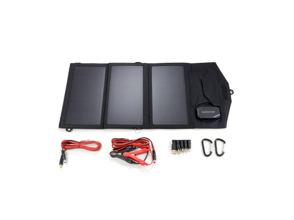 Výkonný skládací 3dílný solární panel (21 W) pro nabíjení akumulátorových zařízení přes USB, 12V i 18V výstup. Vhodný například pro chytré telefony, tablety, notebooky.