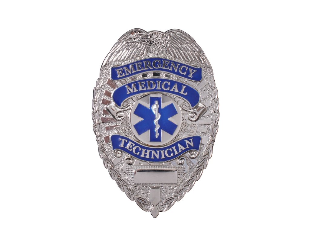 Kovový stříbrný odznak s nápisem Emergency Medical Technician je označení pro zdravotníky. Zapínání na zavírací špendlík. Rozměry jsou cca 5,5 cm x 8,3 cm.