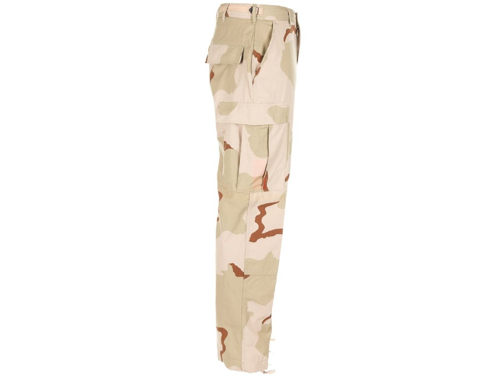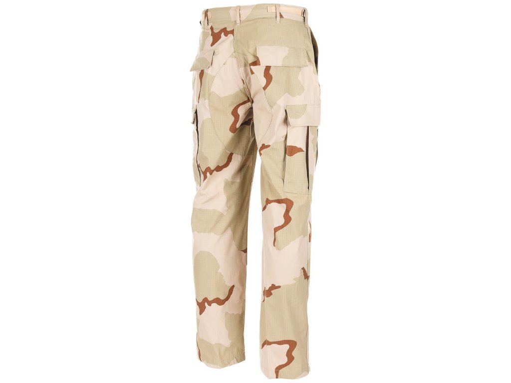 Originální použité kalhoty 3-colour desert BDU (Battle Dress Uniform) z výprodej americké armády. Dvě boční kapsy pro ruce, dvě velké stehenní kapsy s patkami, dvě velké zadní kapsy s patkami, zesílené sedlo a kolena, šněrování v nohavicích.