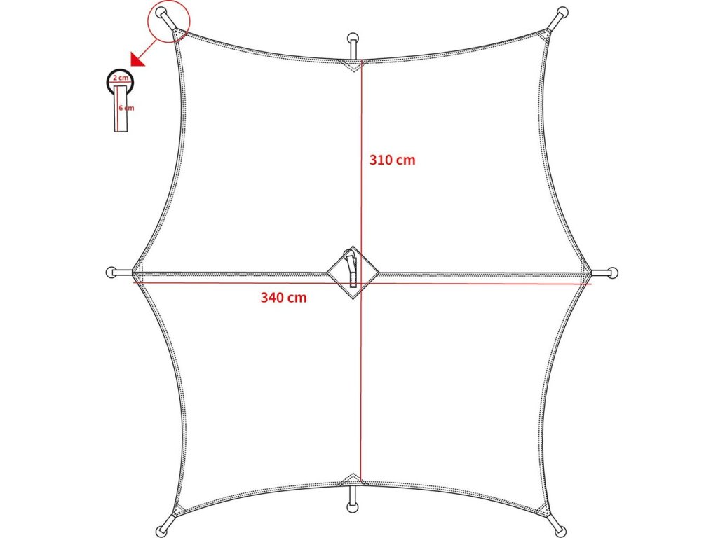 Díky speciálnímu tvaru HEXAGONÁLU a velikosti, zejména vhodné pro houpací sítě nebo použití jako stanová plachta, pláštěnka, sluneční plachta. Celkem 9 smyček s kovovými kroužky vč.8 kolíků a 8 kotevních šňůr.