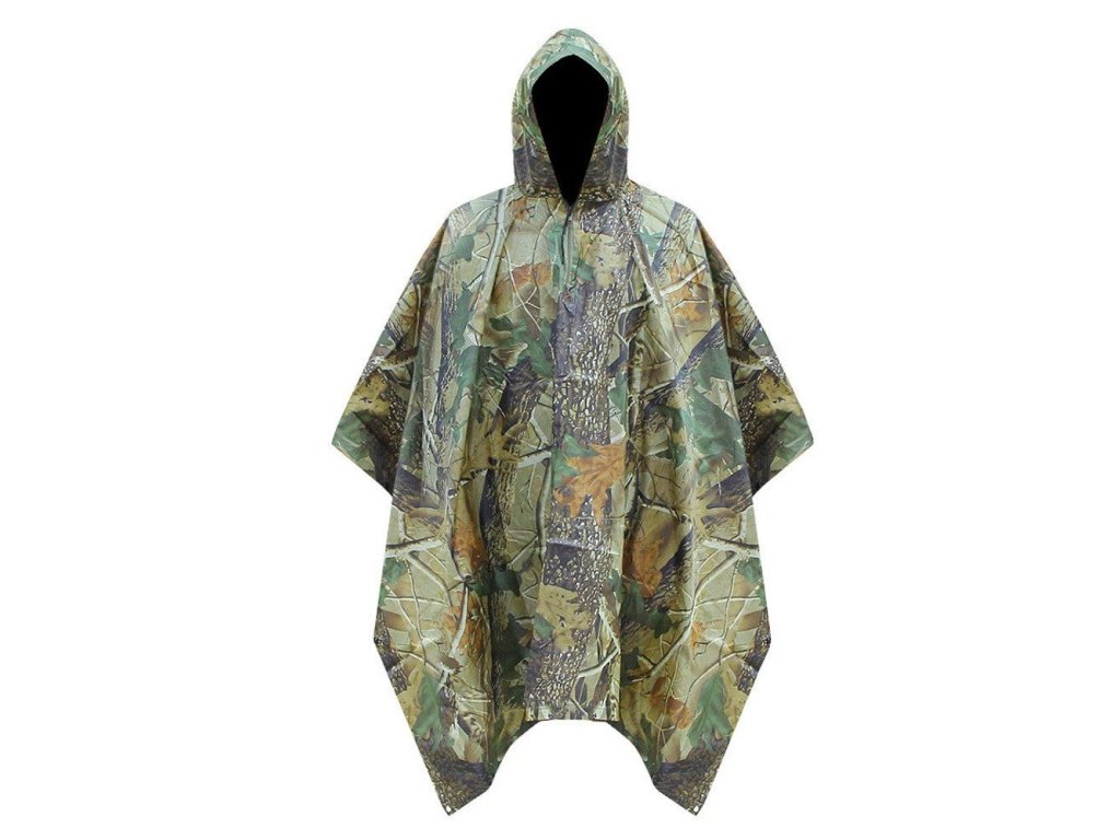 Pončo do deště s lesním maskování. Stahovatelná kapuce, zapínání na bocích na druky, 4 kovová oka. Hmotnost 810 g, rozměry 100 x 138 cm. Vnitřní část pogumovaná. Přepravní pouzdro součástí.