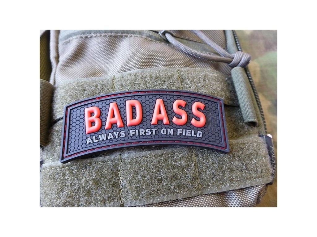 Plastová černočervená nášivka s 3D nápisem "Bad Ass, Always First on Field" (Tvrďák, v boji vždy první). Rozměr cca 87 x 37 mm, na rubu se suchým zipem. Perfektní pro cokoli, kde máte velcro panel.