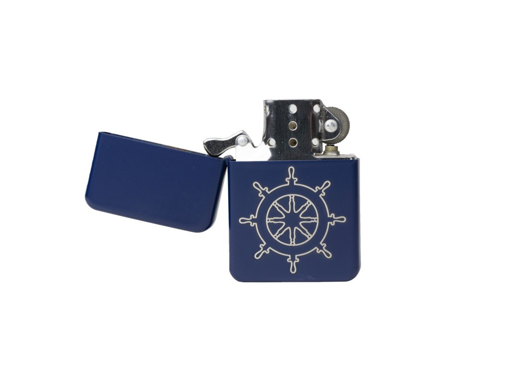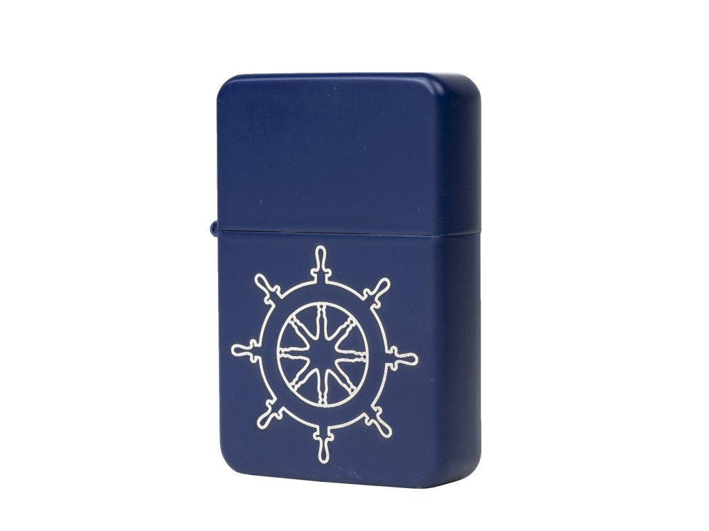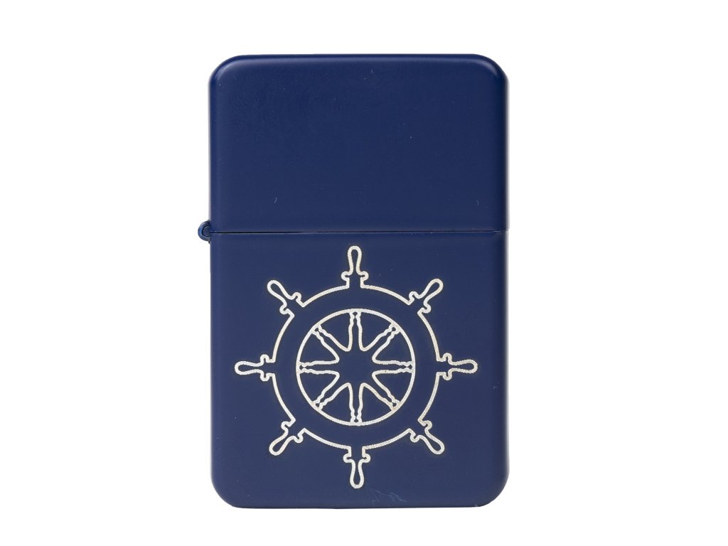 Benzinový kovový zapalovač s kormidlem uprostřed přední strany. Kormidlo je na zapalovači vygravírované. Rozměry zapalovače: 57 x 38 x 13 mm. Benzín není součástí. Povrch zapalovače je modrý, matný.