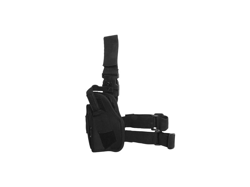 Taktické stehenní pouzdro na pistol užívané v armádních, policejních a bezpečnostních jednotkách. Na levé stehno či opasek. Barva: černá . Vhodné pro všechny typy krátkých zbraní. Nastavitelná délka popruhu na jištění zbraně.