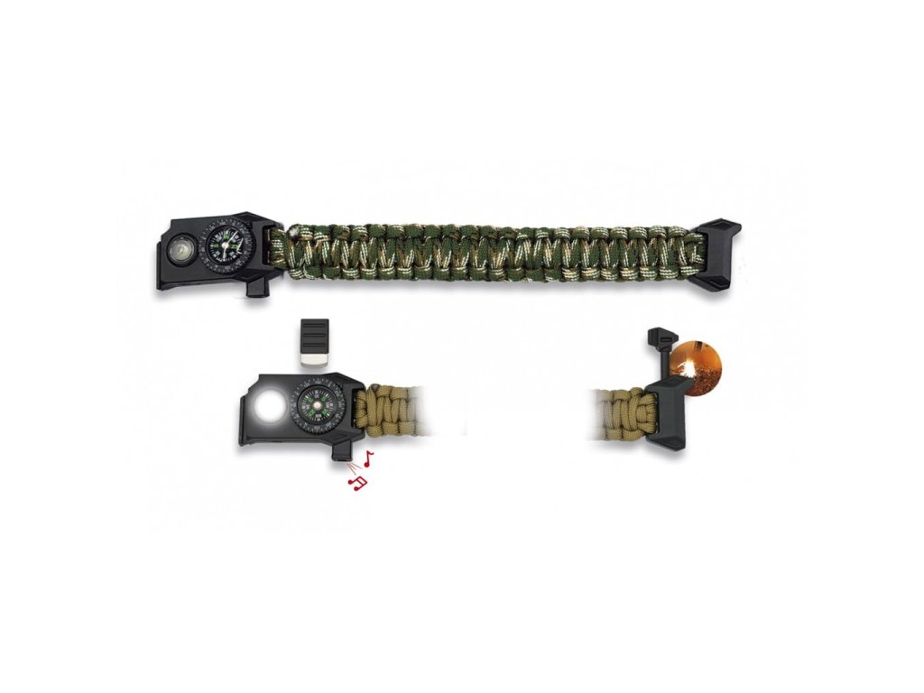 Lehký paracordový náramek s kompasem, nouzovou píšťalkou, malou svítilnou a nouzovým křesadlem. Náramek má délku 24,5 cm a je vyrobený z odolného nylonu. Hmotnost: 41 g