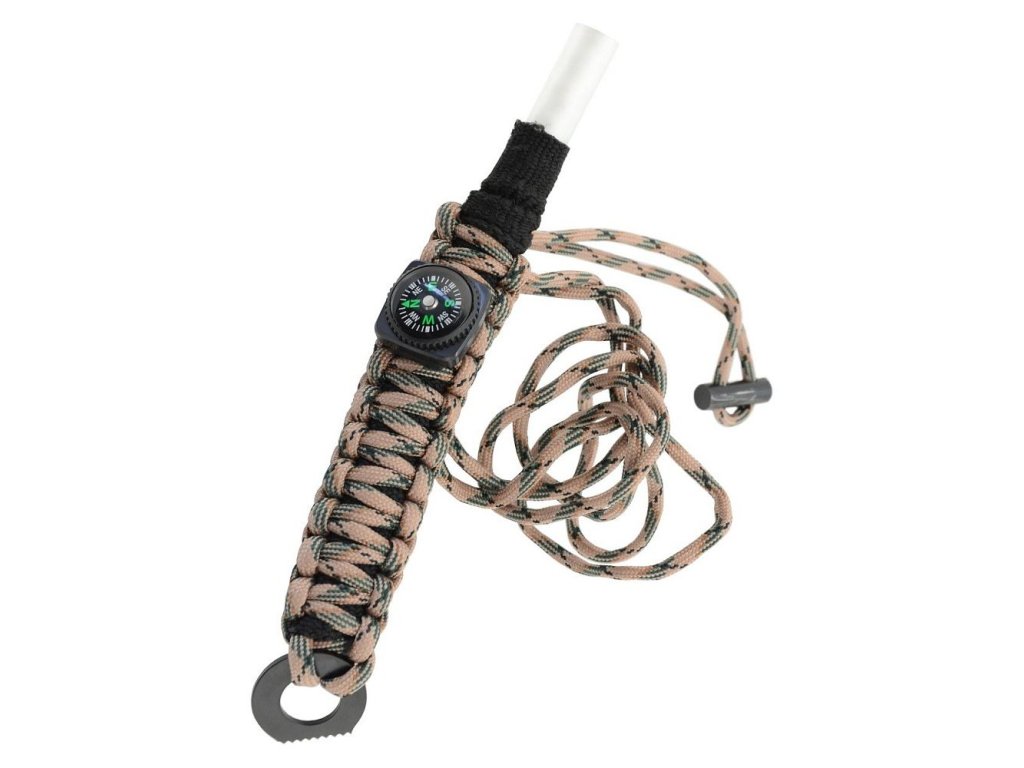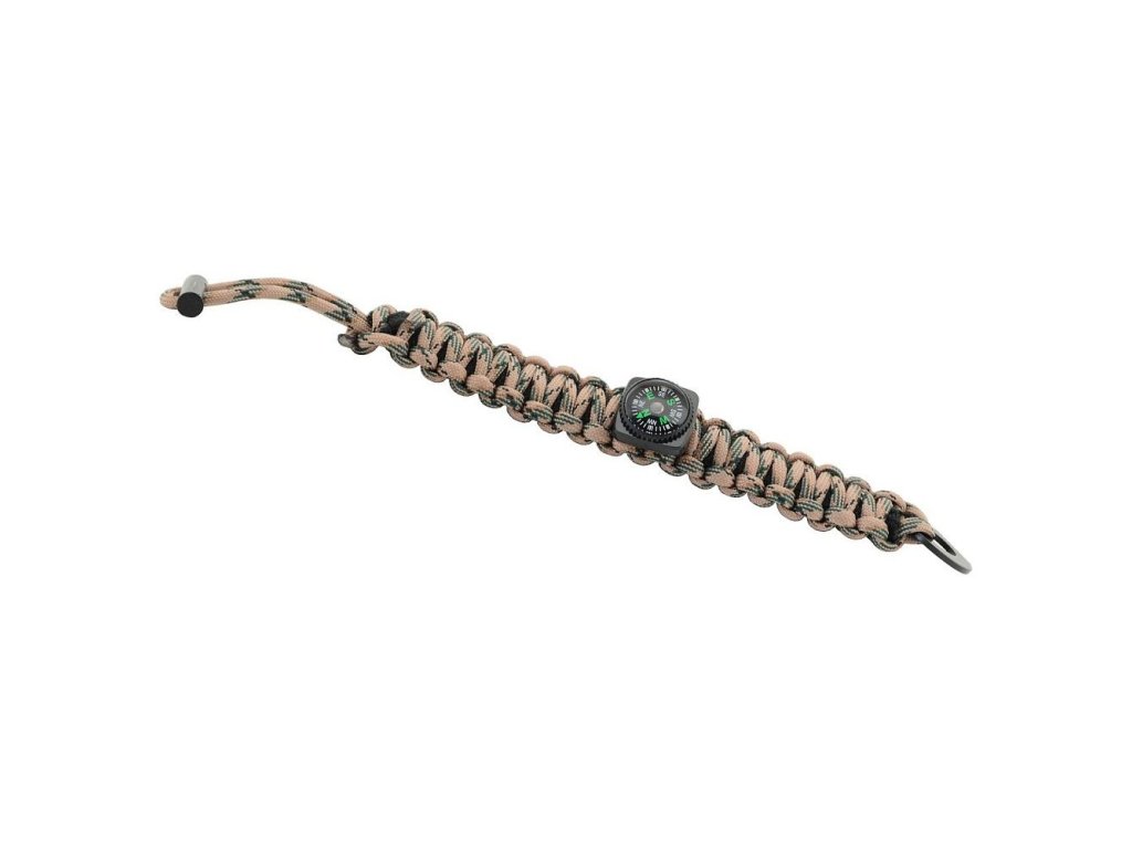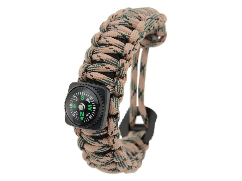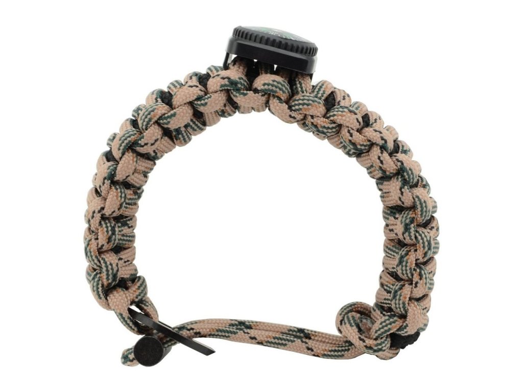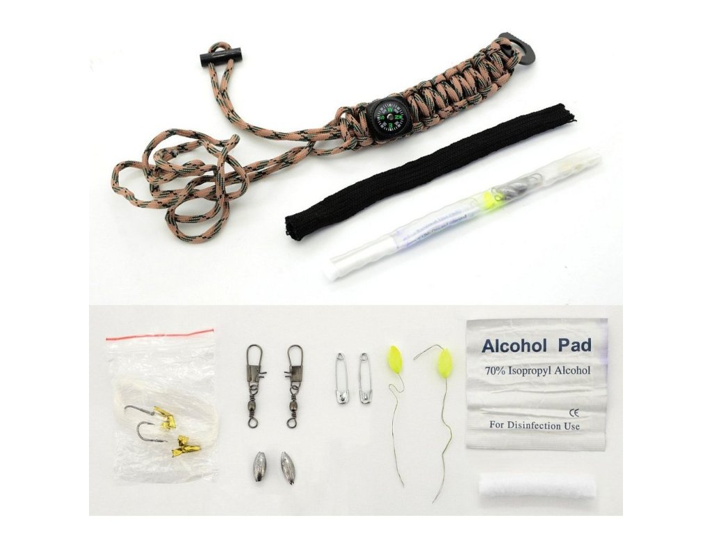 Náramek, ve kterém je vpletená nouzová sada pro přežití. Uvnitř najdete - háčky na rybaření, špendlíky, vlasec, tampon, čisticí ubrousek. Součástí náramku je křesadlo, pilka, kompas, 2,7 m šňůry.